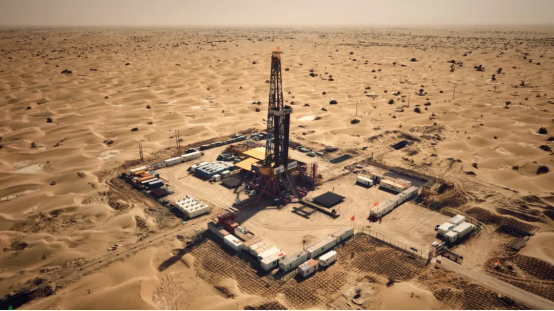 “地壳一号”万米科研钻机综合技术水平达到国际先进水平,填补了国内空白,成为国际上第一口钻穿白垩纪陆相地层的科学探井。图为2024年10月,“地壳一号”万米钻机在新疆塔克拉玛干沙漠里工作。